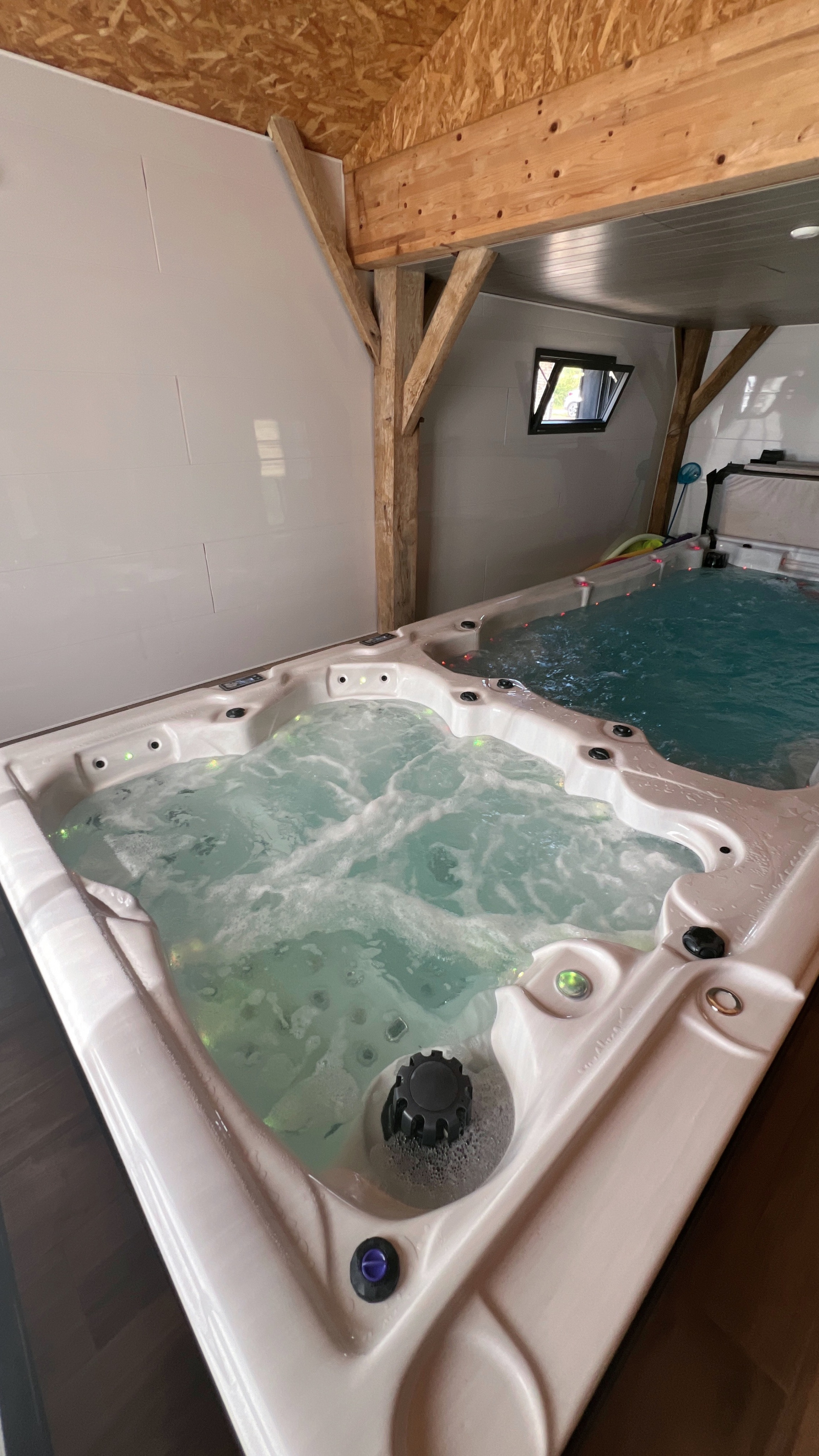 Spa de nage et jacuzzi abrités dans le hangar